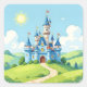 Cute blue and white castle with red flags on a bright summer day. This beautiful whimsical illustration with the sun, clouds, blue sky and green hill grass.