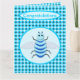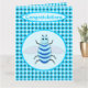 This card features a graphic image of a cute blue baby boy bee with black legs and beady eyes. He has a pale blue fuzzy body with bright blue stripes and cute blue antennae on his fuzzy head. His delicate little wings have a pale blue mottled pattern on them.