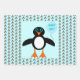 This awesome set of gift wrap features a cute cartoon of a blue penguin with blue eyes, a little orange beak and a white tummy. The penguin is holding a powder blue balloon. There is pale blue text inside the balloon that says, “Baby boy”.