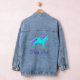 This awesome denim jacket features a digital art image of a cute magical blue baby boy unicorn. The main body of the unicorn is blue and the mane and tail are two different shades of blue. The unicorn has golden hooves and a bright shiny gold horn on top of its head. It has a blue diamond shaped eye. The unicorn has a big smile on its face. There is custom text so you can include a message.