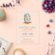 Blue acrylic baby shower invitation with a little chick hatching from its egg. The colour palette is blue, yellow and orange. The illustration represents a baby chick hatching and the text reads " A little chick is about to hatch". Illustrated and designed by Patricia Alvarez.