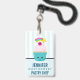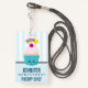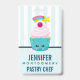 Name badg ewith a light blue and white striped pattern paired with a blue and pink polka dot pattern. Layered over top is a cute blue cupcake with pink frosting and a kawaii smiling face. A cherry on top also has a cute happy face. A shooting star is flying in the air