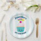 Party paper plates with a light blue and white striped background. Layered over top is a cute blue cupcake with pink frosting and a kawaii smiling face. A cherry on top also has a cute face. A shooting star is flying in the air. Personalize with a name and event title such as a birthday or baby shower.