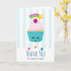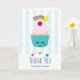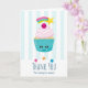 Birthday party thank you greeting card with a light blue and white striped background. Layered over top is a cute blue cupcake with pink frosting and a kawaii smiling face. A cherry on top also has a cute face. A shooting star is flying in the air. Personalized message on the front and inside the card.
