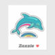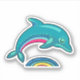 A vinyl decal illustrated with a cute drawing of a blue dolphin jumping up over rainbow coloured water. Whimsical and fun.