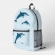 Adorable, sweet, gender neutral light blue backpack featuring three blue playful dolphins. Text can be personalized or removed. Perfect for dolphin lovers for school or sports activities.