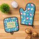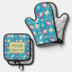 This cute oven mitt and pot holder features an adorable pattern with colourful white birds, red hearts, and sweet yellow mugs against a bright blue background. Personalize with your name. Makes the perfect gift for your wife, mom, or grandma for Mother's Day, birthday, or special occasion.