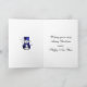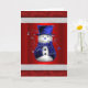 A cute blue snowman, dressed in blue velvet vest and top hat, with stars and bows around him, on a metallic red background. He is framed by red velvet (printed only) and white Christmas Santa suit fur. The message inside reads, "Wishing you a very merry Christmas and a happy New Year" may be personalized to suit.