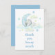This baby shower thank you enclosure card design for guests is mainly of light blue colours. This card design features a cute blue, sleepy teddy bear on a cloud with a crescent moon and stars. The back of card is in blue. It also comes with a personalized message at the back of card. Simply use the 'Personalize' tool to edit the message. Pair this thank you card with other similar designed baby shower must-haves in this collection. Visit the store for more.