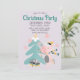 This custom Christmas holiday party invitation features a cute, girly boho style cartoon illustration. A pretty pink unicorn is decorating her Christmas tree beneath falling snowflakes. The background is a soft lavender purple colour.