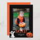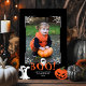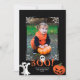 This cute Halloween photo card features one vertical photo, cute ghost and pumpkin illustrations, a black background, and the greeting "BOO!" in orange on the front. On the back you will find the an orange background (which can be changed if desired). Further customize this design by adding a photo and/or text to the back!