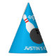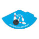 Add your own custom text. Blue or custom background colour. Bowling pins and ball strike design. Cone shape paper hats with string.