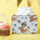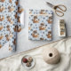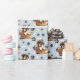 An adorable little brown and white Boxer puppy laying in a wicker basket is the feature in the pattern on this all occasion gift wrapping paper. The portrait is amid a pattern of black paw prints and white bones, and is repeated on a silver blue background. Perfect for any Boxer Dog lover!