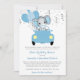 This adorable drive by baby shower invitation features blue and grey baby boy elephant wearing a mask with balloons and confetti driving a convertible. Back features blue background. Easily customized for your event by clicking "Personalize".