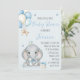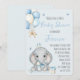 Celebrate your little prince with this charming boy baby shower invitation! A sweet elephant wearing a dapper bow and a crown sets the scene, surrounded by festive balloons, a cupcake, and a wrapped gift. The soft blue palette and whimsical details create a joyful, storybook feel—perfect for honoring the upcoming arrival with love and laughter. Ideal for tea parties, garden showers, or any celebration with a royal twist.