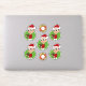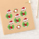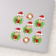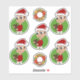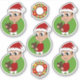 Set of seven cut-vinyl stickers with an illustration of a cute little happy smiling Hispanic or Asian boy with a teddy bear, who is dressed in Christmas clothes and is wearing a red Santa Claus hat, on a green background; five stickers of the boy and two stickers with a Christmas wreath