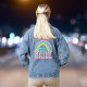 Funny and cute hippie-inspired denim jacket for the bride-to-be at her bachelorette party. The back features "The Bride" in a large pink and teal blue retro font, 70's style pop-art flower illustrations and a pink, blue, green and yellow rainbow. A coordinating "The Party" jacket is available for the bach squad.
