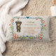 A birth pillow with all the details. Designed with a simple illustration of a cartoon brown bear holding a yellow daisy. Hello written above his head. Sueeounded by decorative floral elements and sprigs.