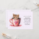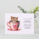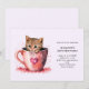 Birthday invitation with a cute little kitten. Sitting in a teacup looking positively adorable. One little paw hangs on the brim. Hearts swirl all around. Sweet and whimsical.