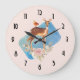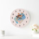 A clock with a pretty brown deer with a white spotted back. A little bird sitting on the deer's back. A fancy floral bouquet with watercolor roses and light olive green leaves under the deer's feet. A blue watercolor rectangle behind the image. A polka dot border along the bottom. Innocent and sweet design with rustic elegance. Peach colored background. Art deco style clock face numbers.