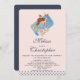 A pretty brown deer with a white spotted back. A little bird sitting on the deer's back. A fancy floral bouquet in pastel pink and green. A blue rectangle behind the image. A polka dot border along the bottom. Innocent and sweet design. Personalize with your wedding details.