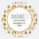 Baby shower save the datestickers with a cute patterned background. Whimsical bees and rainbows with little hearts and stars scattered around. Adorable and delightful. A circle frame layered over top with your text inside.