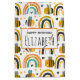A birthday gift bag with a cute patterned background. Whimsical bees and rainbows with little hearts and stars scattered around. Adorable and delightful.