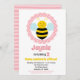 This girl's birthday invitation features a funny fat bumble bee with pink polka dot and striped background.