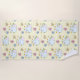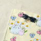A beach towel with a cute mom and baby bunny standing together. Yellow daisies in the background. Whimsical butterflies fluttering about.