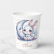 Super cute paper cup featuring cute white little bunny wearing a beautiful cute bow sitting near a silver moon with some gold falling stars.
