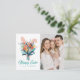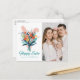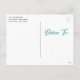 Cute Easter photo postcard featuring a white bunny holding a bouquet of colourful spring flowers with a white background. "Happy Easter" is displayed in bold teal script lettering with your name shown below. The back of the Easter postcard displays your return address with space for your custom message.