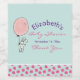 Wine labels for a baby shower. Designed with a whimsical white bunny holding a big pink balloon floating up in the air. Pink polka dot circles create a cute and charming border. Set on a light blue-green background.