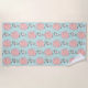 A beach towel with a whimsical white bunny holding a big pink balloon floating up in the air. Set on a light blue-green background.