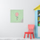A poster with a whimsical bunny holding a big pink balloon floating up in the air. Set on a light green background.