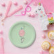 Paper plates with a whimsical bunny holding a big pink balloon floating up in the air. Set on a light green background. A little bluebird sits on top of the balloon, whistling a tune surrounded by song notes.