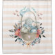 A cute shower curtain. Peach and white striped pattern. A digital illustration made with watercolors. A charming bunny rabbit wearing a blue dress sitting in a basket surrounded by her eggs. Butterflies flutter around the basket which is decorated with a fancy flower bouquet.