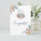 Congratulations card. Designed with an illustration created with watercolors. A cute momma bunny dressed in blue sitting in a basket surrounded by eggs. Butterflies and flowers around the basket. Tulip floral bouquets in the corners.