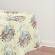 A tablecloth with an illustration created with watercolors. A cute bunny rabbit wearing a blue dress sitting in a basket surrounded by her eggs. Butterflies flutter around the basket which is decorated with a fancy flower bouquet. Light yellow background.