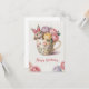 A birthday greeting card featuring a playful watercolor-style illustration of a tiny bunny with a bright pink bow peeking out from inside a ceramic coffee mug and delicate pastel-coloured roses.