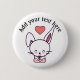 Personalize this fun badge by using the template to add your own text. A cute white cartoon bunny rabbit with a pink love heart above his head and holding a small orange carrot.