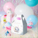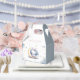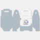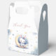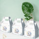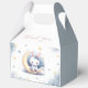 Super cute favour box featuring cute white little bunny wearing a beautiful blue bow sitting on a lovely moon with some gold falling stars and some dusty blue clouds.