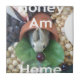 This delightful artwork features an adorable bunny stepping out of a pot, happily munching on a juicy plum. Accompanying the charming image are the playful words "Honey, I am home," perfectly capturing the essence of comfort and joy.