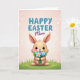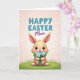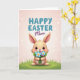 This card features a light-brown bunny with soft fur in the lower half of the design, gazing up with big dark eyes and a shy blush on its cheeks 🐰. The bunny cradles a small bouquet of blue and pink flowers with yellow centers, and the way its paws curl around the stems reads like a sweet offering to a close friend. Fresh green grass stretches along the bottom edge, framing the character like a little spring meadow. Behind it, the background fades from pale pink to creamy off-white, with tiny glowing dots scattered like gentle sparkles. Near the top, the greeting text sits centered in medium blue letters, with a smaller flowing line of text placed just beneath it. The soft lighting and pastel palette give the scene a tender, affectionate mood, like a quiet moment shared between two people 🌷. The bouquet’s green leaves fan outward, and the flowers sit just above the grass line in the bunny’s paws.