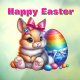 a bunny wearing a pink bow, sitting next to vibrant Easter eggs