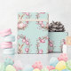 This wrapping paper features a pattern of cute young bunny rabbits holding pink Easter eggs. The rabbits are surrounded by natural wreaths of twigs and more pink and mauve Easter eggs. The background is a soft teal green watercolor look.