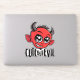 Vector cartoon illustration of a devilishly cute little devil with big eyes with Cute But Evil text. Keywords: devil, hell, cute, demon, evil, satan, halloween, monster, horns, horror, adorable, sweet, devilishly, devilish, precious, endearing, lovable, lovely, appealing, engaging, delightful, dear, darling, winning, winsome, charming, enchanting, attractive, pretty, adorbs