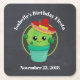 Birthday or other event personalized paper coaster. Designed with a cute illustration of a cactus, with big kawaii eyes, smiling and wearing a red sombrero. The background is a black chalkboard image.