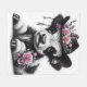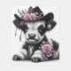 Illustration of a young black and white cow, styled with a decorated hat and floral accents, evoking themes of nature, innocence, and beauty through its charming composition and artistic presentation.