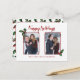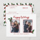 Festive holiday design featuring cute custom calligraphy script red "happy holidays" greeting with bright green and red holly embellishments and two-photo template. Back features complementary holly pattern with blank label and suggested greeting.