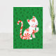 The grooming routine of a red and white striped candy cat can only end in tears...or peppermint hairballs. Green background pattern features fish skeletons and Christmas trees. Designed by Kaz Foxsen.